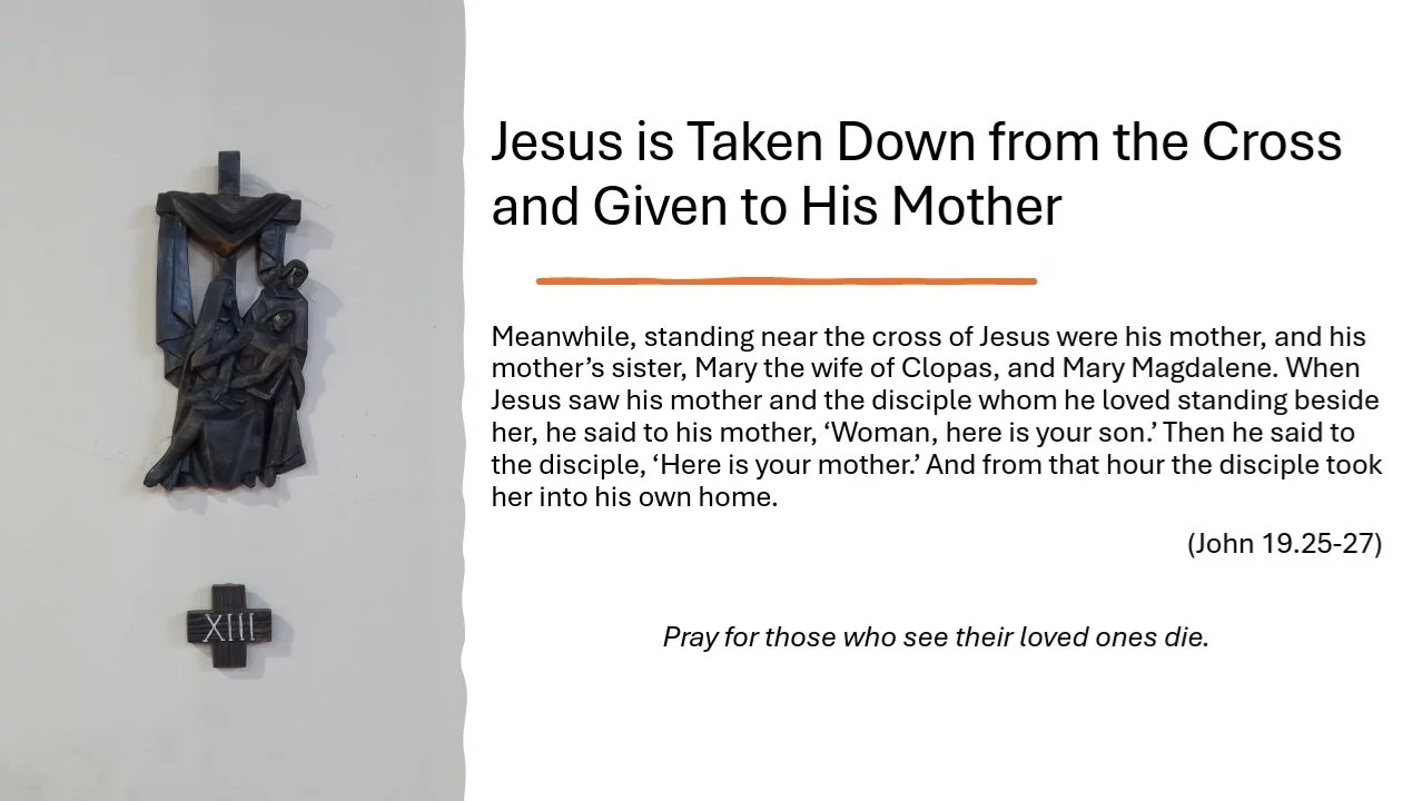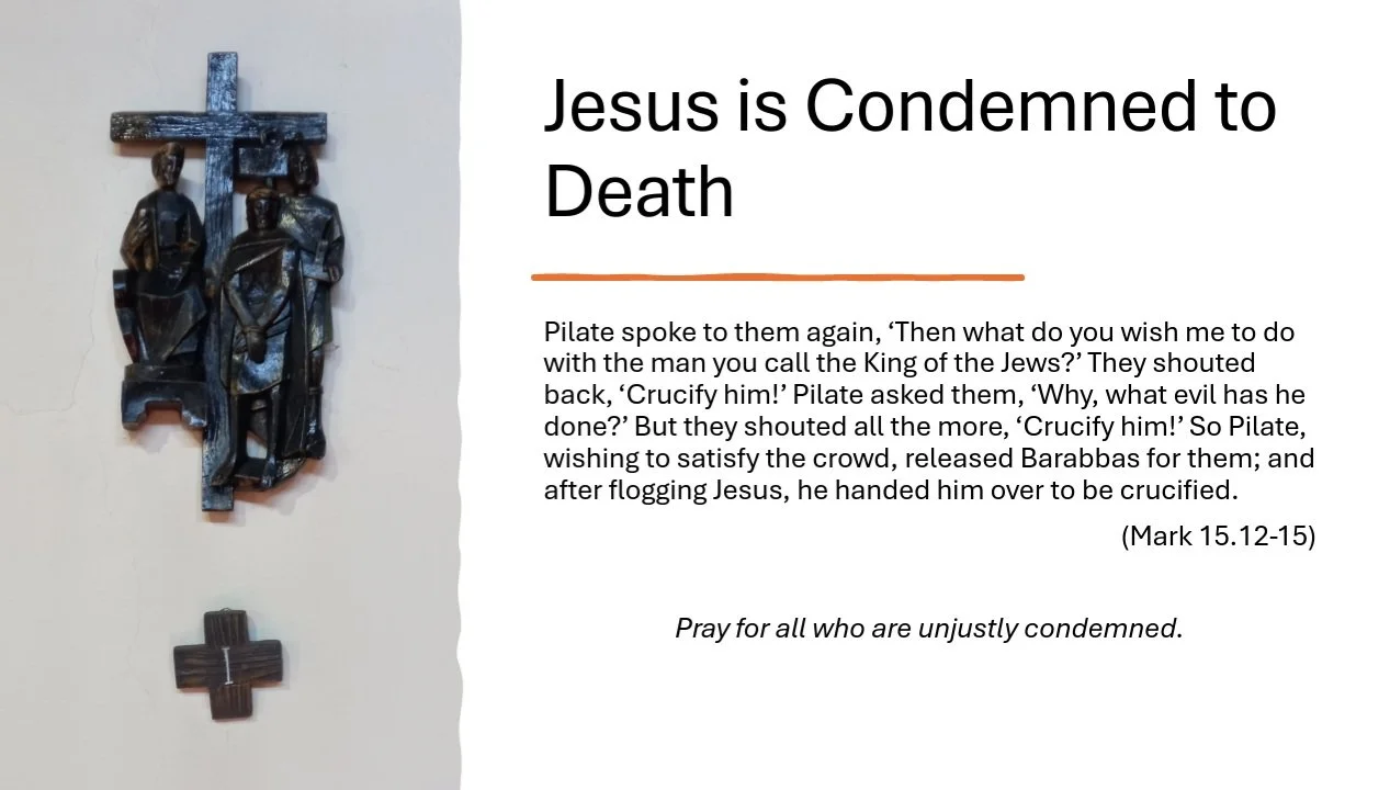 In St. Margaret’s, the stations are sculptures, hung in an anti-clockwise sequence, starting from the left of the organ, and concluding to the left of the memorial chapel. As you approach each station, you might like to use the following traditional prayer:-